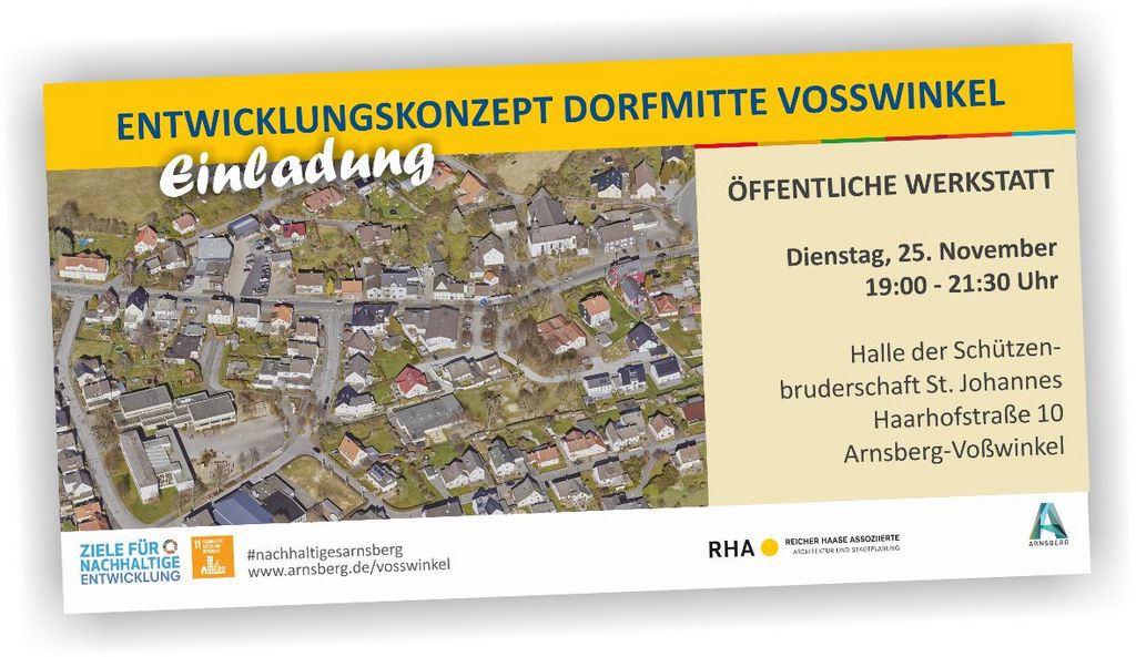 Mit dem ENTWICKLUNGSKONZEPT DORFMITTE VOSSWINKEL wird ein wichtiger Beitrag zur Umsetzung der Globalen Nachhaltigkeitsziele (SDGs - Sustainable Development Goals) der Vereinten Nationen und der Nachhaltigkeitsstrategie der Stadt Arnsberg geleistet.