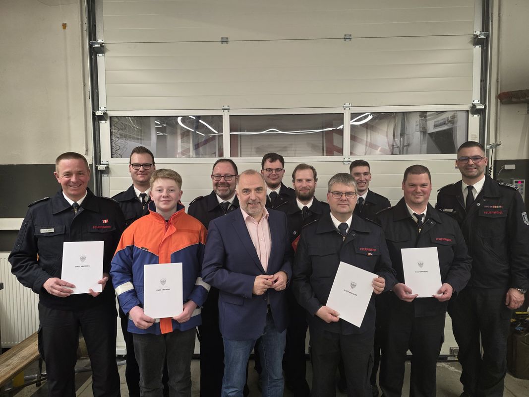 Der Holzener Löschgruppenführer Florian Dolle konnte am Samstagabend seine Kameradinnen und Kameraden der Einsatzabteilung, einige Mitglieder der Ehrenabteilung, den stellvertretenden Wehrführer Sascha Ricke sowie Bürgermeister Ralf-Paul Bittner zur Hauptdienstbesprechung im heimischen Gerätehaus begrüßen. Nach der Auflösung der Basislöschzüge und der Neustrukturierung der Feuerwehr Arnsberg im vergangenen Jahr war es die erste Holzener Dienstbesprechung unter seiner Leitung. Unterstützung erhielt er dabei von seinem Stellvertreter Max Otte, der im Verlauf des Abends seine Beförderung zum Brandmeister entgegennehmen durfte.