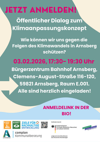Die Stadt Arnsberg mit ihren drei Siedlungsschwerpunkten und zahlreichen Ortsteilen ist unterschiedlichen Klimarisiken ausgesetzt. Um diesen Herausforderungen systematisch zu begegnen, hat die Stadt Arnsberg im Rahmen des Aktionsprogramms Natürlicher Klimaschutz (ANK) und der Förderrichtlinie "Maßnahmen zur Anpassung an die Folgen des Klimawandels" (DAS) einen Antrag gestellt, der Ende 2024 positiv beschieden wurde.