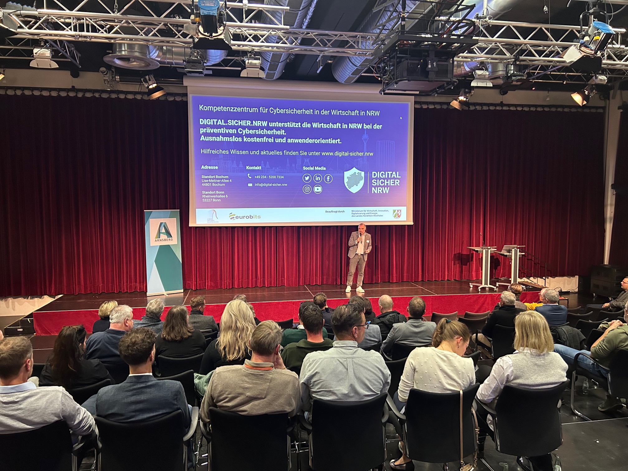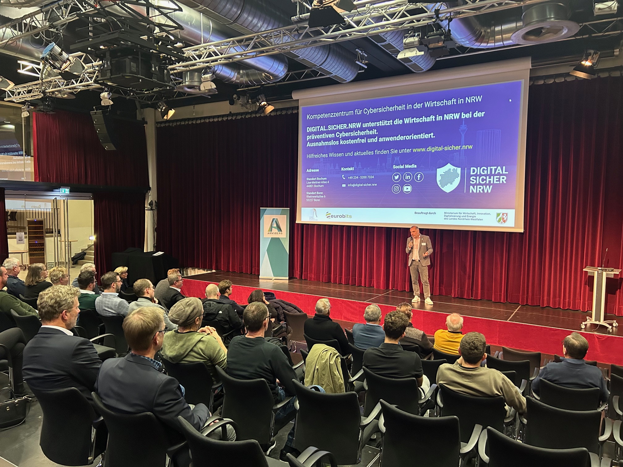 Aus diesen Gründen beschäftigte sich der Unternehmensstammtisch mit dem Thema “Cybersicherheit für Unternehmen". Sebastian Barchnicki, Geschäftsführer des Kompetenzzentrums für Cybersicherheit in der Wirtschaft DIGITAL.SICHER.NRW, lieferte einen hochinformativen und zugleich unterhaltsamen Vortrag mit dem Titel "„Machen wir gemeinsam die „Tür zu im Netz“: Wie Sie das digitale Dauerlüften in Ihrem Betrieb beenden“. Seine Worte machten deutlich, das IT-Sicherheit für alle Unternehmen ein zentrales Zukunftsthema darstellt.