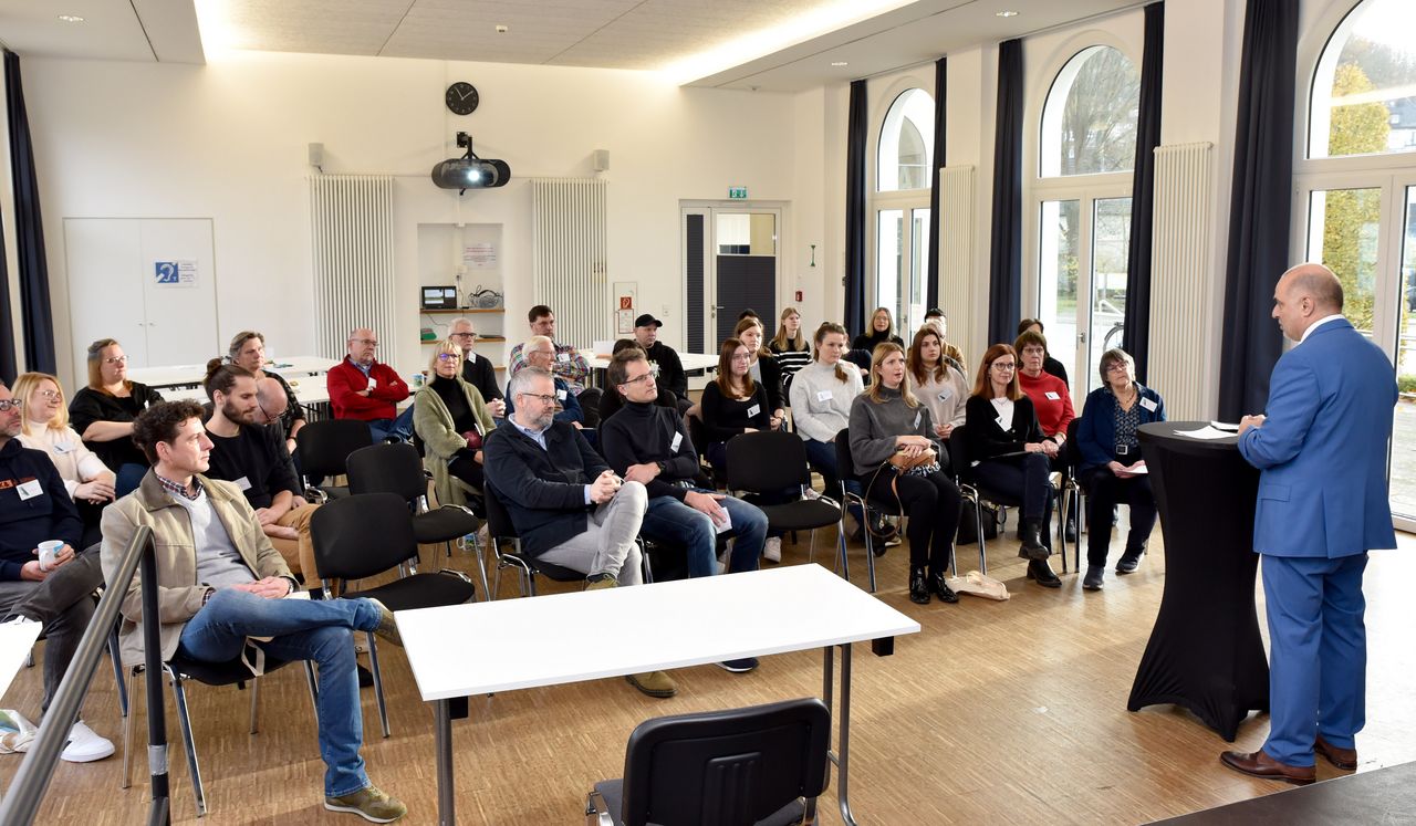 Bürgermeister Ralf Paul Bittner begrüßt die Teilnehmenden des 3. Bürger:innenrates, die sich Ende November 2024 zur Beratungen im Bürgerzentrum Bahnhof Arnsberg getroffen hatten.