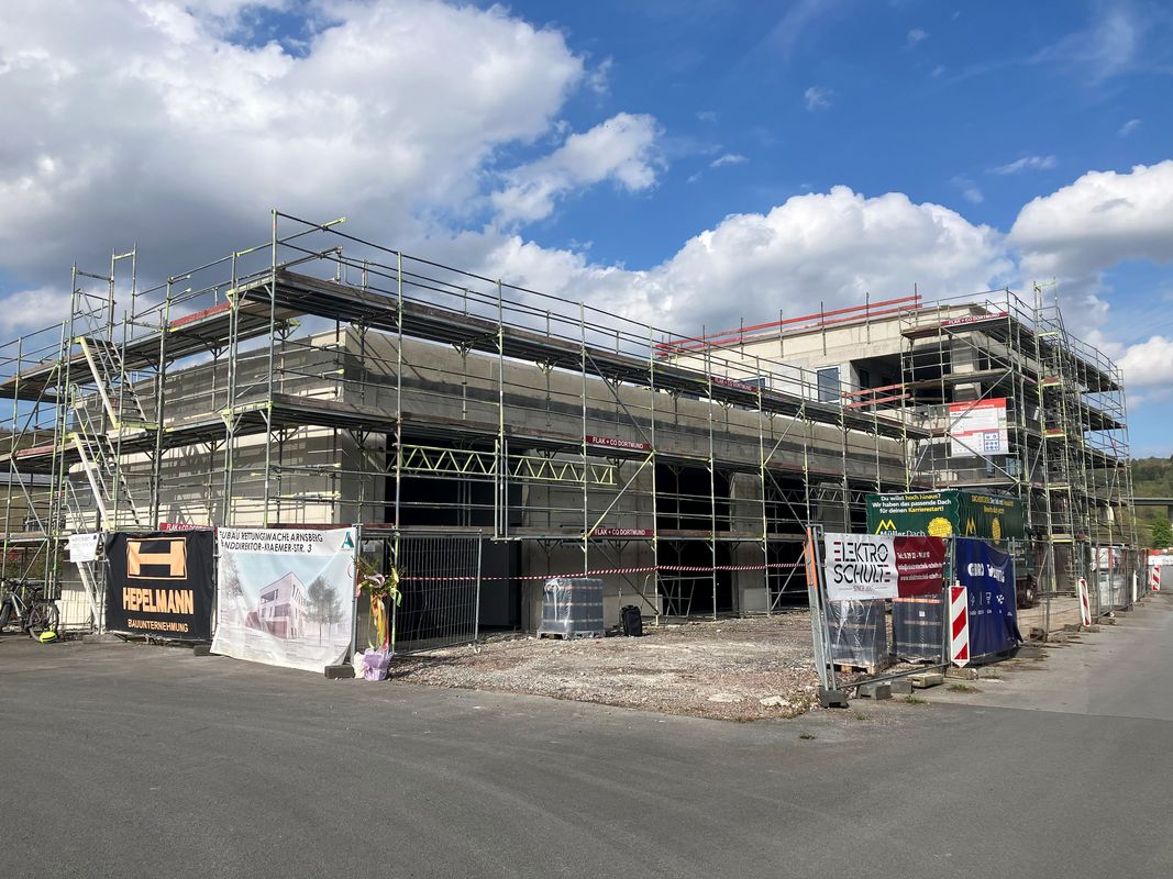 Mit neuen Maßstäben für die notfallmedizinische Versorgung der Bürgerinnen und Bürger sowie für die Arbeitsbedingungen der Mitarbeitenden im Rettungsdienst der Stadt Arnsberg ist der Bau der Rettungswache an der Branddirektor-Kraemer-Straße in Arnsberg bereits weit fortgeschritten. Im Juli 2025 begannen die Arbeiten in der Nachbarschaft zum Feuerwehrmuseum „Brennpunkt“ am Bahnhof Arnsberg, am Donnerstag konnte nun das symbolische Richtfest gefeiert werden. Im Beisein von Bürgermeister Ralf Paul Bittner, dem Ersten Beigeordneten Christopher Hilverling sowie Vertreter:innen aus der Lokalpolitik, Mitarbeitenden des Rettungsdienstes sowie der Feuerwehr der Stadt Arnsberg und der Architekturbüros sowie vom Gebäudemanagement der Stadt wurde der Baufortschritt mit Blick auf die Fertigstellung im Spätherbst 2026 gefeiert. Das Grußwort für den Hochsauerlandkreis sprach der stellvertretende Landrat Sascha Walenta aus Arnsberg.