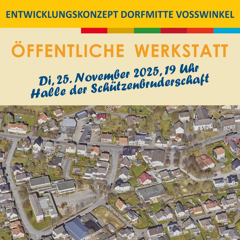 Die Stadt Arnsberg lädt alle Bürger:innen von Voßwinkel herzlich ein, an der Öffentlichen Werkstatt zur Entwicklung der Dorfmitte Voßwinkel teilzunehmen. Die Veranstaltung findet am Dienstag, 25. November, von 19 bis 21.30 Uhr in der Halle der Schützenbruderschaft St. Johannes, Haarhofstraße 10, statt.