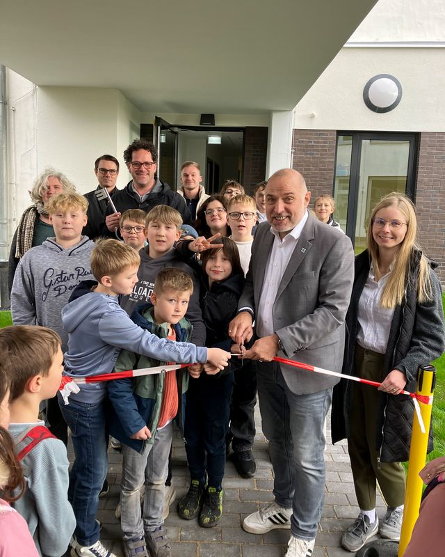 Im Beisein vieler Beteiligter an der Umsetzung der umfangreichen Sanierungsarbeiten für den Offenen Ganztag an der Fröbelschule in Arnsberg schnitt der Arnsberger Bürgermeister gemeinsam mit Schülerinnen und Schülern der Schule das Band zur Übergabe der neuen Räumlichkei-ten durch.