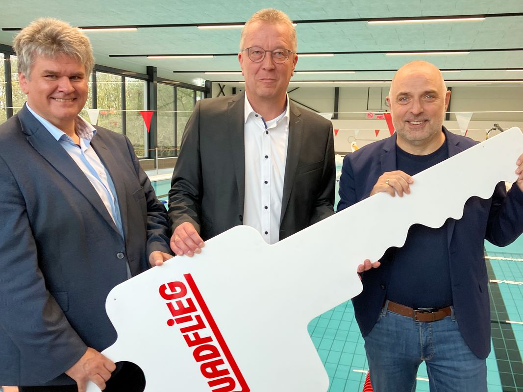 Stadtkämmerer Rainer Schäferhoff, NASS-Geschäftsführer Bernd Löhr und Bürgermeister Ralf Paul Bittner übergaben am Sonntag das neue Schul- und Vereinsbad "Auf der Alm" im Stadtteil Arnsberg.