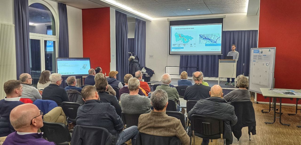 Im Rahmen eines interaktiven Gallery-Walks wurden die vier zentralen Handlungsfelder, Siedlungsraum und Gesundheit, Wirtschaft und Infrastruktur, Wasserhaushalt sowie Landschaftsraum und Biodiversität, des Klimaanpassungskonzeptes vorgestellt und gemeinsam diskutiert. Es wurden Maßnahmen besprochen, die dazu beitragen sollen, die Folgen von Starkregenereignissen – wie beispielsweise Hochwasser – künftig abzumildern und die Widerstandsfähigkeit der Stadt zu stärken.