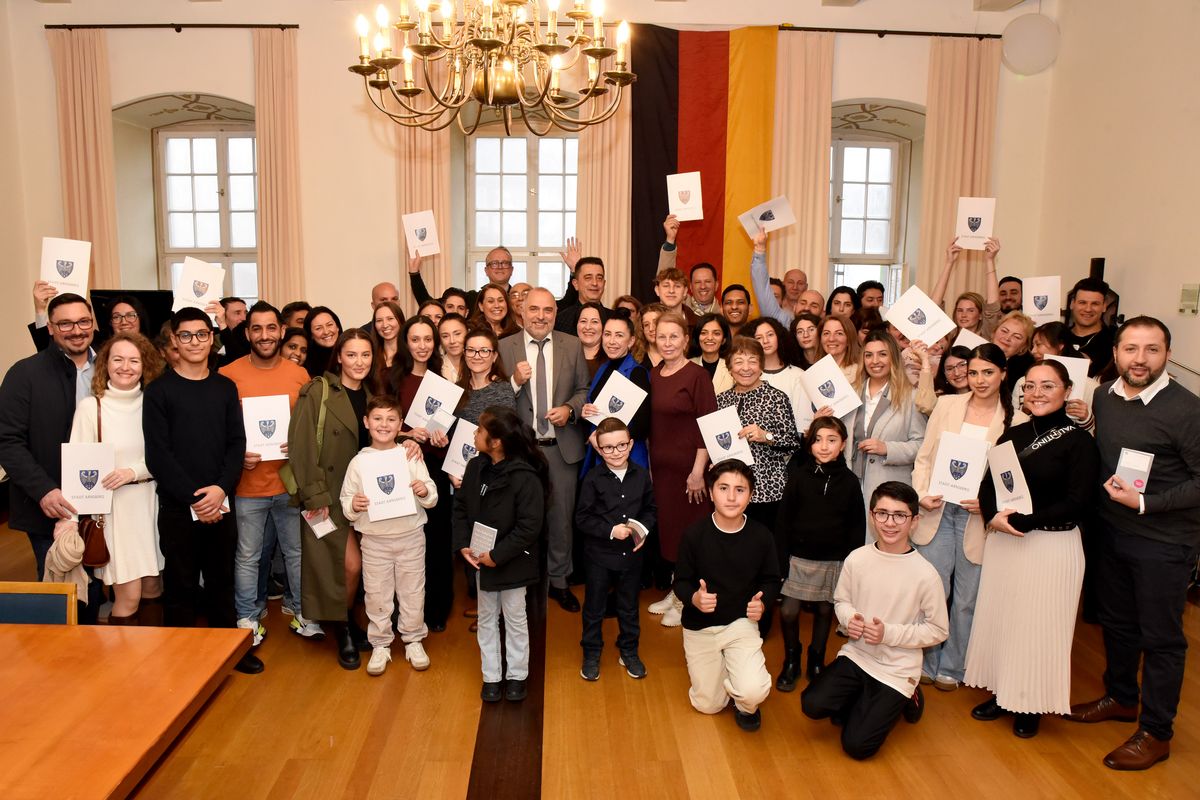Die Stadt Arnsberg hat jetzt ihre zweite Einbürgerungsfeier in diesem Jahr begangen. Im Rittersaal des Alten Rathauses übergab dazu erneut Bürgermeister Ralf Paul Bittner die Urkunden an 71 Personen, die mit der Übergabe zu deutschen Staatsbürger:innen wurden. Durch die Reformierung des Staatsbürgerschaftsrechts im Juni 2024, das u.a. eine verkürzte Einbürgerungsfrist bei Vorliegen bestimmter Voraussetzungen bereits nach fünf Jahren sowie die Beibehaltung einer weiteren Staatsbürgerschaft ermöglicht, gibt es auch in der Stadt Arnsberg ein verstärktes Interesse an Einbürgerungen.