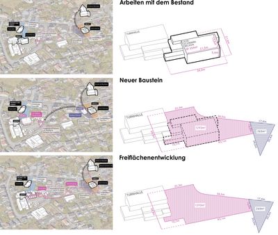 Während eine Variante „Arbeiten mit dem Bestand“ eine Ertüchtigung des Gebäudes des ehemaligen Lehrschwimmbeckens für öffentliche Nutzungen vorsieht, geht die Variante „Neuer Baustein“ von einem Neubau in diesem Bereich aus, der als Multifunktionsbau für Schule, Kita, Jugend und Dorfgemeinschaft dienen könnte. Die dritte Variante „Freiflächenentwicklung“ dagegen sieht den Abriss des Gebäudes des ehem. LSB vor und eine Gestaltung des Bereiches als naturnaher Freiraum und „Grünes Klassenzimmer“.
