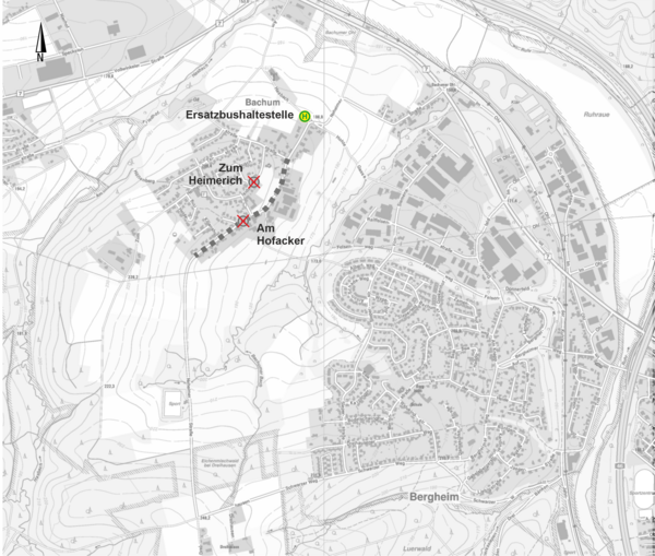 Während der Bauarbeiten kann der Busverkehr nicht die Haltestellen Am Hofacker und Zum Heimerich anfahren. Eine Ersatzhaltestelle in der Straße Am Hasbach ist eingerichtet.