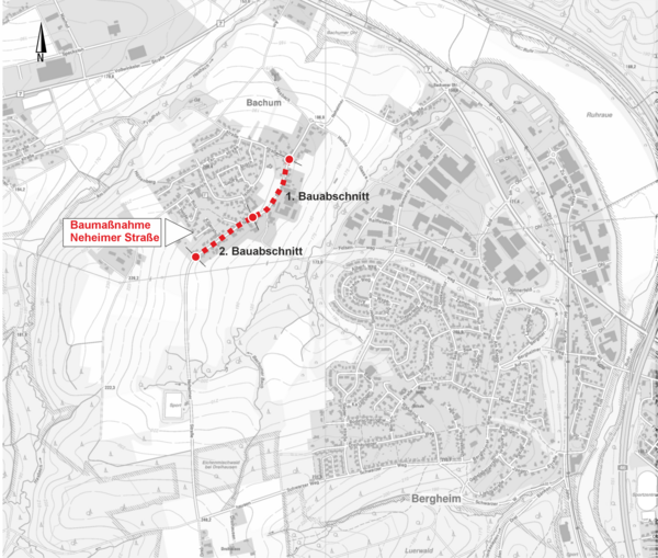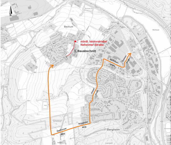 Begonnen wird mit dem 1. Bauabschnitt. Während der Baumaßnahem an der Kreuzung nördliche Isidorstraße / Neheimerstraße ist Bachum von der B7 über die Umleitungsstrecke über Bergheim erreichbar. Die Umleitung führt über Donnerfeld - Raiffeisenstraße - Sleperstraße - Schwarzer Weg - Dreihausener Weg. Sobald die Arbeiten an der für die Erreichbarkeit für Bachum wichtigen Kreuzung nördliche Isidorstraße/Neheimer Straße fertiggestellt sind, kann Bachum auch wieder direkt von der B7 erreicht werden. Die Umleitungsstrecke bleibt weiterhin bestehen, da Teile der Neheimer Straße während der Baumaßnahme nur über die Umleitung erreichbar sind.